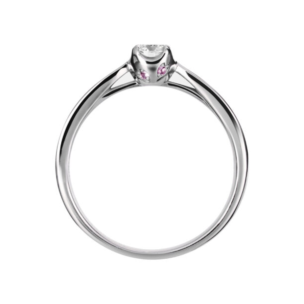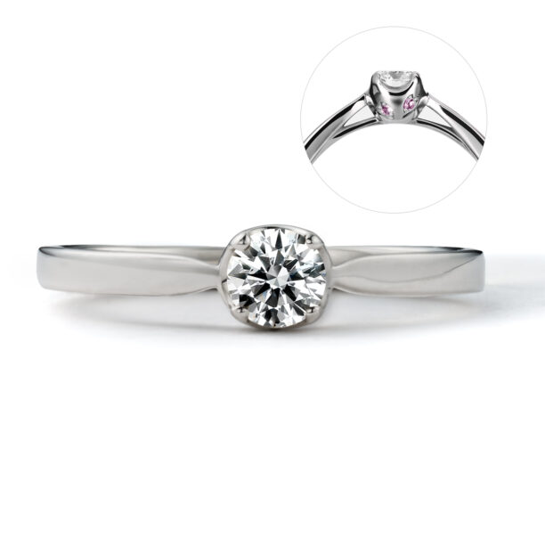 婚約指輪ピンクの桜の花びらが2枚添えられ、幸せがおふたりにふわりと舞い降りる瞬間をかたちにしたデザインです。春のあたたかな日の幸せが、ずっと続くように祈りを込めています。