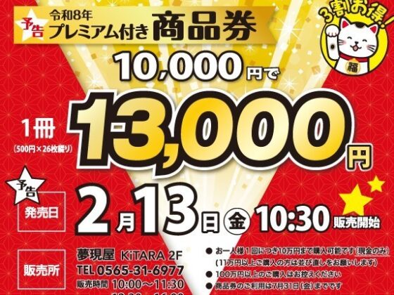たっぷりあります!R8.2.13~発売中!豊田市駅前商業協同組合 プレミアム付き商品券! | 豊田市駅前商業協同組合